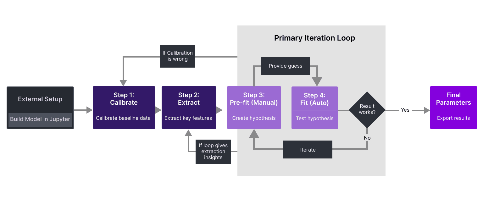 I mapped the end-to-end characterization process to understand the problem space. This revealed a clear pipeline, a critical Pre-fit ↔ Fit iteration loop, and opportunities to reduce friction through better structure.